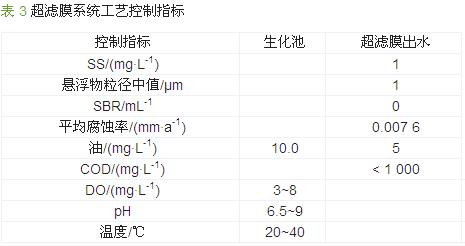 超濾膜采用德國BERGHOF膜組件,膜道8 mm,膜孔30 nm。經(jīng)生化處理后的含油廢水由進(jìn)水泵打入超濾膜系統(tǒng),膜系統(tǒng)產(chǎn)水經(jīng)轉(zhuǎn)子流量計(jì)計(jì)量后排入凈水罐,部分濃水回流至生化系統(tǒng),部分濃水由循環(huán)泵與進(jìn)水混合重新進(jìn)入超濾膜〔7〕。超濾膜處理系統(tǒng)流程見圖 3。工藝控制指標(biāo)見表 3。